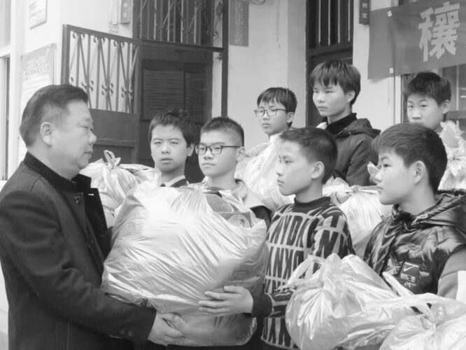 11月10日,邓州市穰东镇人大代表、穰东镇第一初中校长李成骥(左一)向受助学生发放衣物。该校近百名教职员工响应校工会号召,积极参加向该校24名因种种原因造成家庭出现暂时困难的学生捐衣献爱心的“暖冬行动”,短短3天时间,活动组委会就收到防寒衣物400余件。 高 峰 席清铎 摄