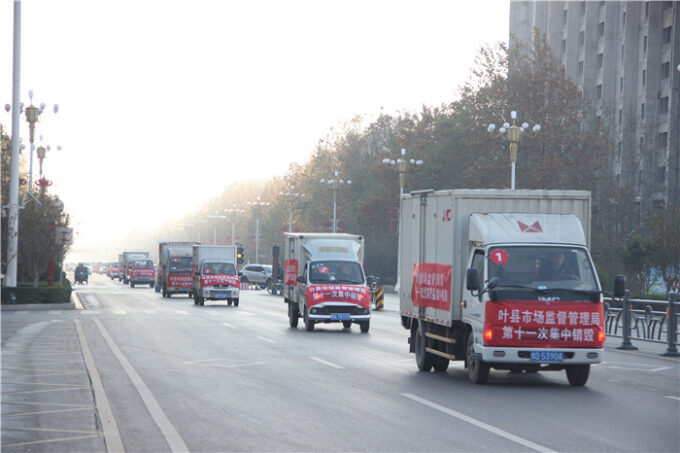 11月18日上午,在叶县文化路上,21辆装载着过期不合格食品、药品、化妆品的大小货车整齐排列,在按照既定路线进行展示后,前往县垃圾处理厂进行集中销毁。这是叶县市场监管局举行的第十一次不合格食品、药品集中销毁活动。