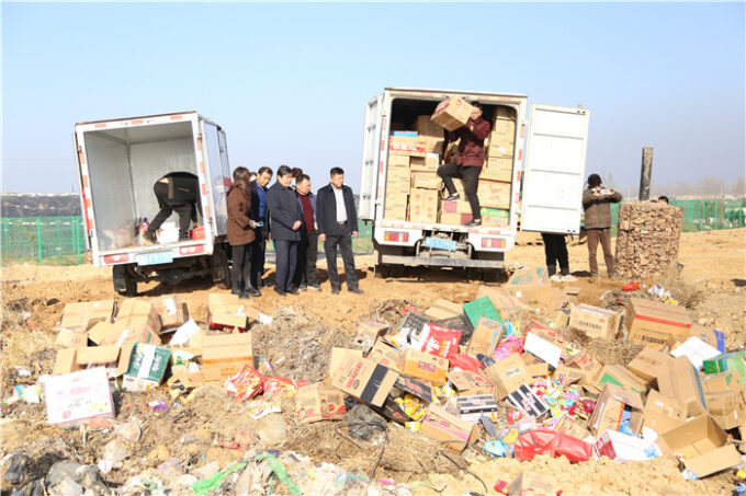 据统计,此次集中销毁活动共计出动车辆21辆,不合格商品3945箱,价值198960.28元,总重7吨。