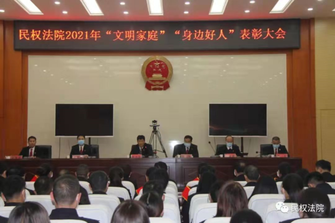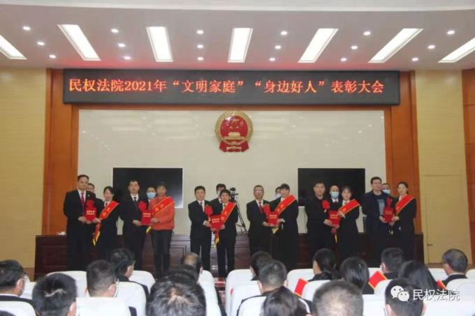 院党组成员、政治部主任赵昌见在宣读表彰决定时指出,今年是中国共产党建党一百周年,为持续深入贯彻习近平总书记关于家训家教家风指示精神,进一步弘扬中华民族传统家庭美德,助推精神文明创建,展示广大干警文明健康、和谐共进的精神风貌,按照政治素质优良、作风正派、诚信友善、文明有礼、夫妻和睦、孝敬父母、团结邻里、尊敬领导、团结同志、爱岗敬业、健康向上等标准,开展了“文明家庭”评选活动。根据部门评议推荐情况,经院党组研究决定,对李晓珂家庭、佟立新家庭、马瑞家庭、李军启家庭、徐嘉家庭、门艳家庭授予“2021年民权法院文明家庭”荣誉称号。他强调,为表彰先进、树立榜样、引领风尚,切实发挥身边好人的示范引领作用,动员全院广大干警参与道德建设,进一步推动全社会形成讲文明、重道德、促和谐的良好风尚,营造文明和谐的法院氛围,按照政治素质优良、作风正派、诚信友善、文明有礼、爱岗敬业、踏实工作、积极作为、勇于担当、乐于奉献、尊敬领导、团结同志、健康向上等标准,通过层层发动,部门推荐,经院党组评议、研究,决定授予王玉海、贾丽、张志勇、沈莹莹、黄海涛、丁玉东等6名干警为2021年民权法院“身边好人”荣誉称号。