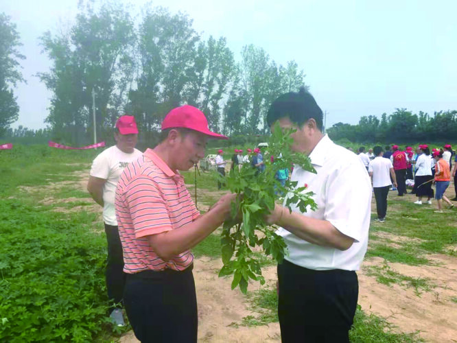 河南农大生命科学学院教授袁志良(前左)介绍外来入侵物种皱果苋的识别方法。(资料图片)