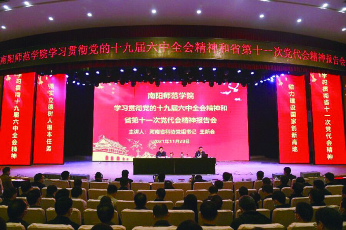 11月20日上午,省科协党组书记王新会赴南阳师范学院作专题辅导报告,宣讲党的十九届六中全会精神和省第十一次党代会精神。南阳师范学院党委书记卢志文主持报告会。
