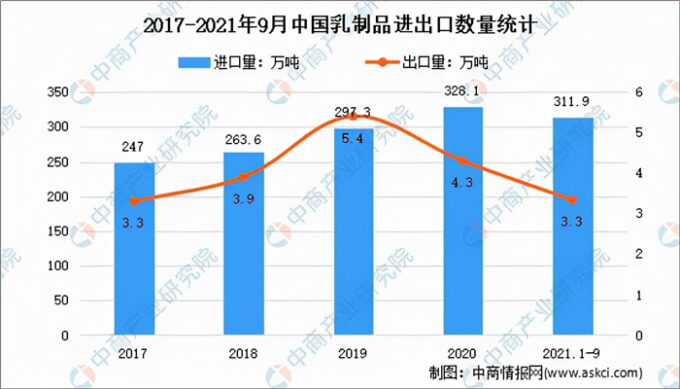 数据显示,2021年1-9月我国共计进口各类乳制品311.86万吨,同比增长27.5%,进口额105.9亿美元,同比增长15.7%。出口各类乳制品33327.73吨,同比增加2.2%,出口额24785.2万美元,同比增长48.3%。