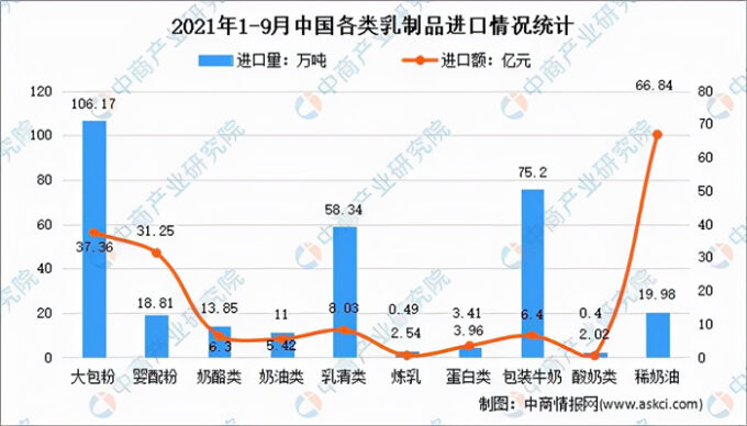 进口的主要品类来看,大包粉、包装牛奶及乳清类为我国主要进口的乳制品。2021年1-9月我国炼乳、稀奶油、奶酪、大包粉、包装牛奶、乳清的增长幅度比较大。