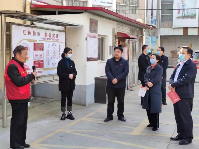 调研组一行先后到顺河街街道建西社区金地·兰乔迪亚小区、马路街街道八一路社区工务段二号院、老街街道老街社区区委家属院实地查看了“红色物业”创建推进情况。