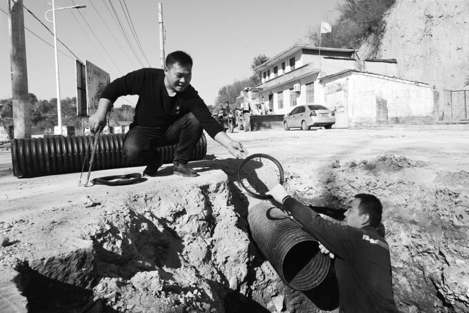11月23日,安阳市殷都区磊口乡安河村党支部书记兼村委会主任郭志飞(左)把密封圈递给正在路基坑里从事污水管网铺设作业的工作人员。为了更好满足安河村218户、760多人生活污水排放需求,该村利用冬闲季节,在村内路面地下埋置污水管网2500余米。 毕兴世 摄