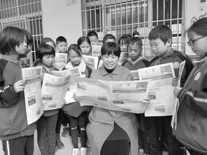 11月24日,邓州市高集镇中心校小学部,孩子们正在老师带领下利用延时离校时间阅读该校“追梦”文学社创办的社刊《追梦》创刊号,社刊由军旅作家、茅盾文学奖获得者周大新题写刊名。“追梦”文学社是该校于近日成立的校园组织,目的是给全镇爱好写作的中小学师生搭建一个相互交流的平台。 高 峰 路银平 摄