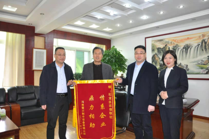 11月26日上午,河南雪川制冷设备有限公司总经理王金权将一面书写着“情系企业 鼎力相助”的锦旗送到了石龙区农信联社党委副书记孙治国手中。
