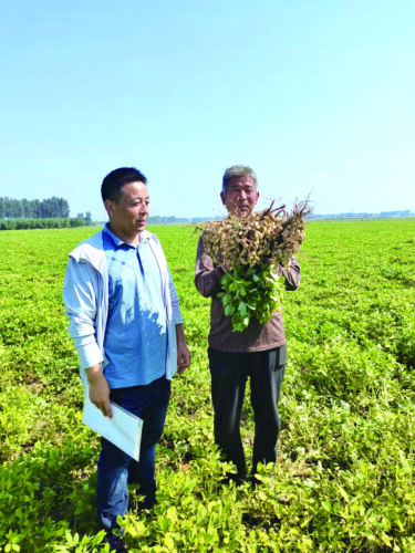 9月29日,郝西(左)在延津县马庄乡示范田察看花生后期生长情况。(资料图片)