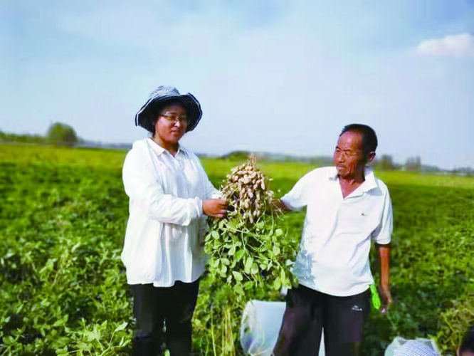 刘娟(左)察看示范区花生长势。(资料图片)