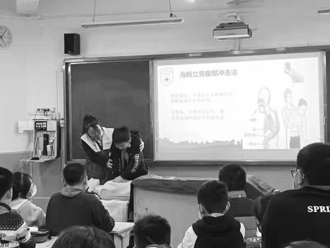 活动过程中,红十字会志愿讲解员张老师通过PPT和视频的形式,详细为学生讲解了急救的基本知识,包括正确拨打120急救电话、止血的目的和方法、喉道异物处理、心肺复苏操作步骤、海姆立克急救法等。专业讲解结束后,张老师现场邀请2名学生进行演练,在演练中带领学生再次复习胸外按压的技巧和人工呼吸的姿势及节奏等,手把手指导每一个细节。最后,张老师向学生详细介绍了不同年龄段异物卡喉的处理办法。