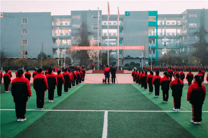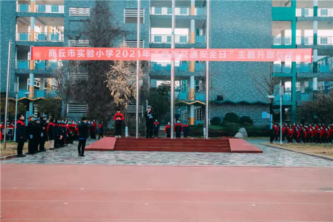 2021年12月2号是第十个全国交通安全日。今年的宣传主题是“守法规 知礼让 安全文明出行”,为了让中小学生了解更多的交通安全知识,切实做好学生安全出行教育引导工作,11月29日上午,商丘市公安局交警支队二大队联合商丘市实验小学举行“2021年全国交通安全日”主题升旗仪式,活动期间交警二大队民警还为广大师生送来一堂生动有趣的交通安全教育课。交警二大队副大队长黄凯以及二大队民警代表,实验小学校长胡霞和部分师生参加此次活动。