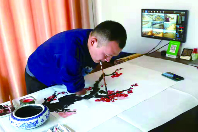 口画用牙齿咬笔,需要防止流口水,怕口水顺着笔杆往下流而打湿宣纸,还要克服咬久了牙根酸痛的困难,有时张海楠练习口画的时间长了,连饭都不愿吃。在学画过程中,父母、亲戚经常鼓励、帮助他,他的表哥帮他介绍了兰考县文化馆的吕家俊老师,吕家俊耐心地指导他,并根据他的实际情况,建议他以画梅花为主,兼画花鸟。终于,张海楠有了一技之长。