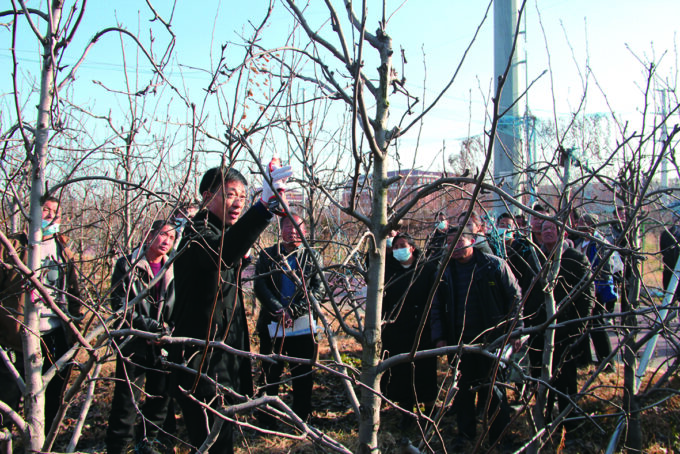 王东升研究员(前)在兰考县农科果园对省力密植树形梨树的修剪要点进行讲解。