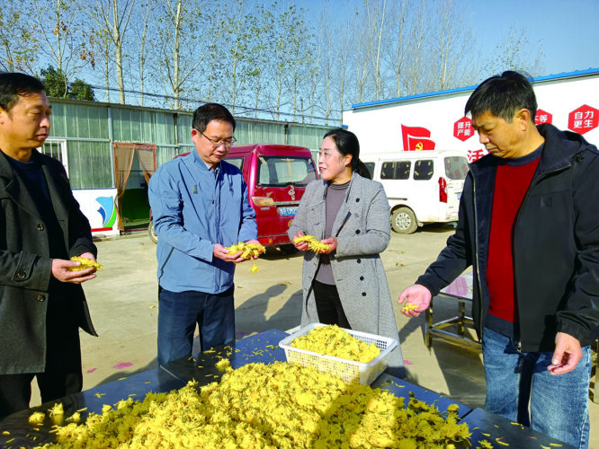 邓州市小杨营镇东楼村党支部书记张宗茹(右二)在介绍金丝皇菊。