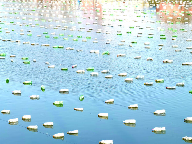 原来,这里是该乡从浙江招商引进的珍珠养殖场。像这样的“好景致”,还遍布徐集乡境内的月亮河、竹楼河等内河水面,总面积超过1200亩。“这‘彩带’不仅仅是好看,水下面吊着的可都是一个个钱袋子呢!”徐集乡负责同志手指河面风趣地说。
