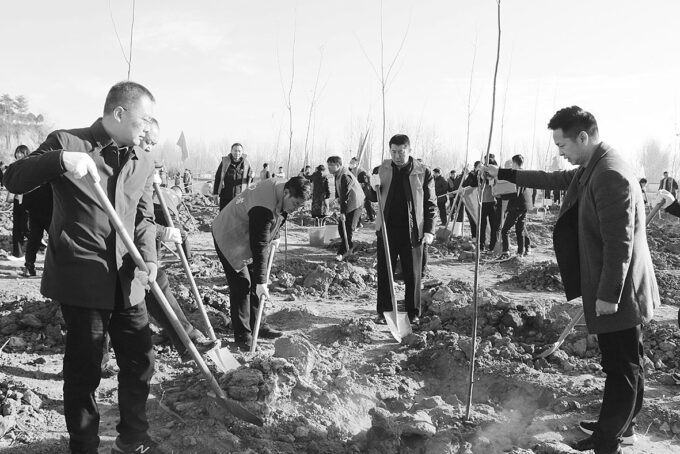 12月4日,平顶山市湛河区干部职工在该区曹镇乡宋寨村西鱼陵山义务植树。据了解,当天该区共有400多名干部职工参加义务植树活动,种植无飞絮杨树2000棵。