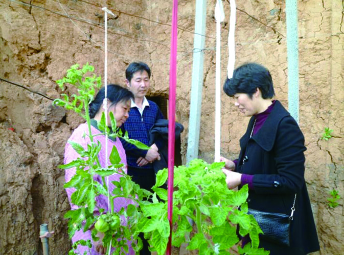 张菊平(右)在给农户讲解番茄抹花注意事项。(资料图片)