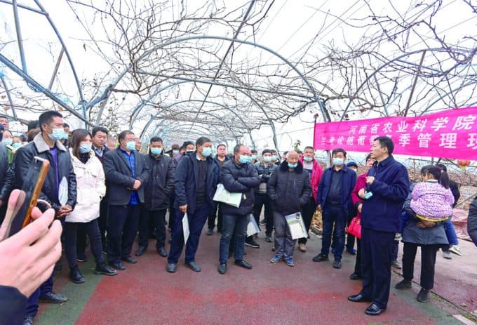 在河南兰玫生物科技有限公司的葡萄种植园区,省农科院园艺所所长、研究员尚泓泉,浆果(葡萄)研究室娄玉穗、张晓锋分别讲解了冬季葡萄修剪要点,张晓锋还现场示范了葡萄修剪方法。尚泓泉介绍,冬季是葡萄休眠季,也是防控病虫害的关键时期,通过修剪平衡树势、补充树体营养,塑造理想树形,为明年丰产丰收打下坚实的基础。