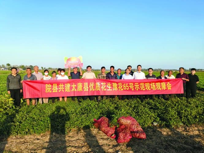 9月29日,在符草楼镇示范基地召开的院县共建太康县优质花生“豫花65号”示范现场观摩会上,周口市农业科学院副院长贾朝阳现场宣布测产结果,该基地花生平均亩产达378.6公斤,比当地花生平均亩产增加了130公斤,增产增收效果明显。