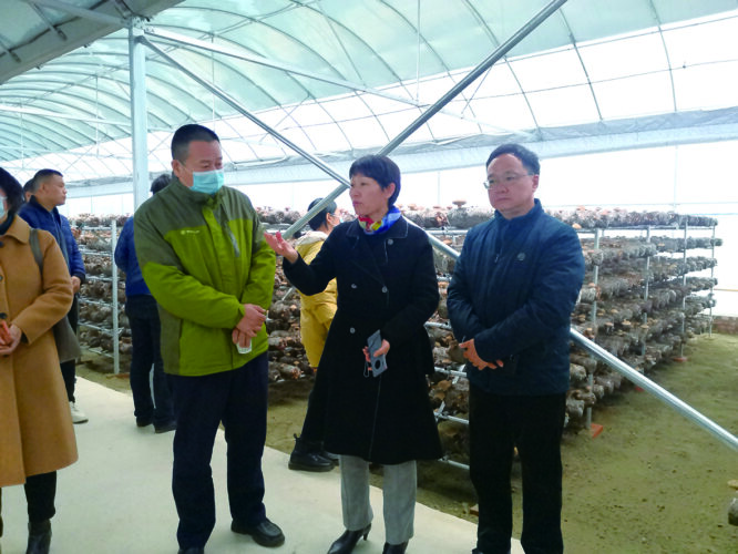 孔维丽副研究员(中)在寨根乡香菇规模化标准化生产基地向与会人员介绍智能化控制香菇大棚。
