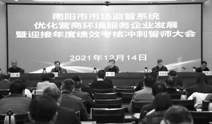 本报讯 12月14日,南阳市市场监督管理局召开全市市场监管系统优化营商环境服务企业发展暨迎接年度绩效考核冲刺誓师大会。南阳市市场监督管理局全体领导,二级单位、各分局、各县局、全市市场监管所负责人等参加会议。会议采取电视电话形式召开。南阳市市场监督管理局党组书记、局长曲岩出席会议并讲话,副局长王松国主持会议。