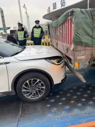 12月20日15时许,在京港澳高速双鹤湖收费站上站匝道,一辆白色越野车“貌似追尾”上了前方一辆红色大货车,两车发生了轻微剐蹭事故。