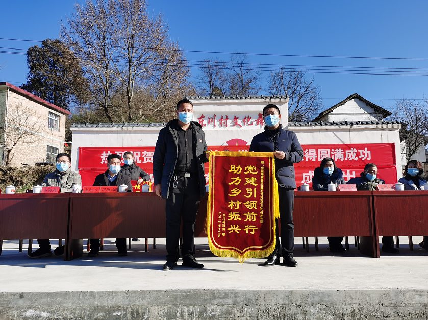 东川村党支部书记张成林(左)向卢氏县邮政分公司总经理赵清瑞(右)赠送锦旗。