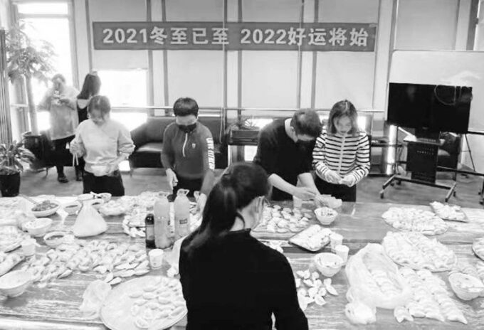 正值冬至佳节,记者走进金象文化,只见员工们正在包着饺子,一片其乐融融的景象。“饺子包得好的和包得不好的,别放一块啊,谁包的饺子好,都跟我包的饺子放到一起。”金象文化总经理李亮科在和公司所有员工包饺子的过程中幽默而亲切地说道。这种氛围让人深切地感受到了“公司就是家”的良好氛围。