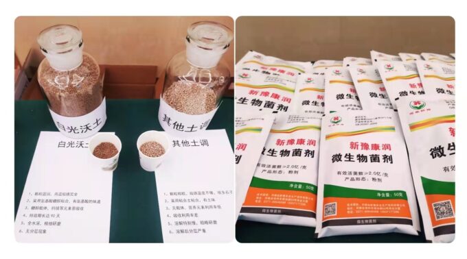 易东海表示,与其他土壤调理剂相比,“白光沃土”在改良土壤时可保持土壤养分的全面均衡;用氨基酸糖醇作为黏合剂,能够使肥效期达90天。“新豫康润”是由高活性的哈茨木霉菌加枯草芽孢杆菌混配的一种微生物菌剂,是符合目前土传病害生物防治新思路的复合菌剂。“新豫康润”不同于市面上其他种类的菌剂,它所具有的微囊技术,能够有效地防治土传病害,应用范围非常广泛。