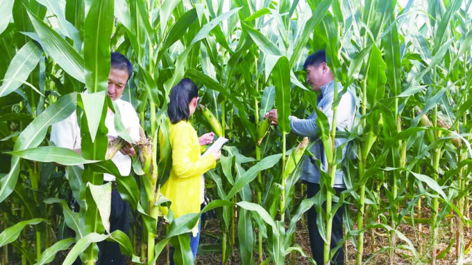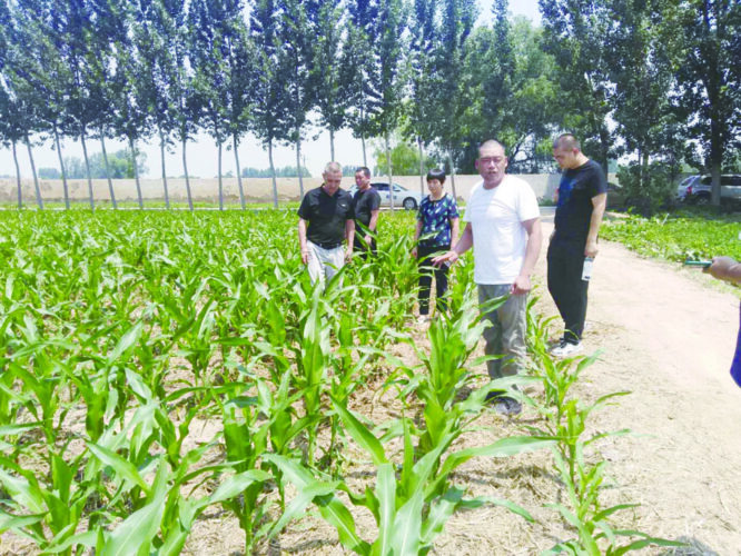 王西贵(左一)在查看玉米生长情况。(资料图片)