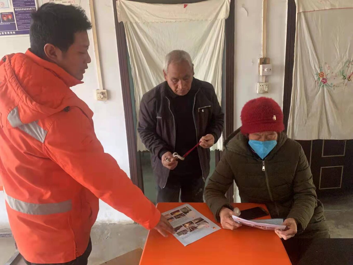 冬日的寒冷把人们都赶进了屋里,袅袅炊烟像把长长的扫帚轻轻掠过静谧的小山村,一群身穿桔红色衣服人的到来打破了乡村的宁静。