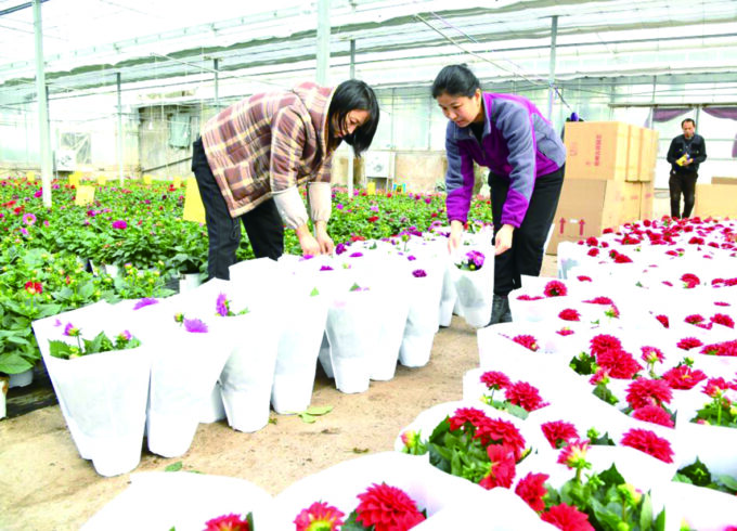 近日,花农在济源市玉泉现代都市农业示范园花卉种植基地为鲜花套袋。 近年来,济源市积极引导农民发展冬季特色花卉种植,该基地培育的大丽花、康乃馨等数十种鲜花畅销市场,冬季特色花卉种植也成为当地农民就业增收的特色产业。 苗秋闹 摄