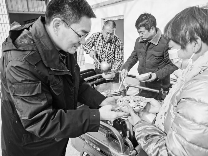 近日,宝丰县石桥镇持续开展“六乱”“六清”集中整治行动,全镇300多名党员、群众在交马岭、石桥等村同吃同劳动,齐心协力改善农村人居环境。图为该镇党委书记马中奎(左一)正在为群众盛饭。 窦传阳 摄