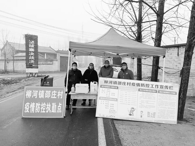 面对当前严峻的疫情形势,宁陵县柳河镇迅速行动,各村委在村头设置疫情防控卡点,对过往的行人车辆进行疫情检查,有效切断疫情传播链,促进疫情防控。图为1月5日上午,该镇邵庄村村委会成员在疫情防控执勤点值勤。吕忠箱 摄