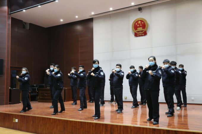 宣誓仪式结束后,全体司法警察警容严整,队列整齐,现场表演了擒敌拳等,以良好的精神面貌展现了司法警察队伍良好的纪律作风。