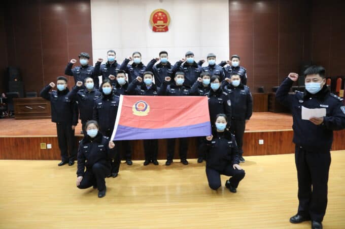 上午9时30分,全体司法警察身着警服,整齐列队,在领誓人带领下,紧握右拳,眼神坚定,以对人民警察崇高事业的敬仰和热爱,郑重而热忱地面向警旗宣誓:“我是中国人民警察,我宣誓:坚决拥护中国共产党的绝对领导,矢志献身崇高的人民公安事业,对党忠诚、服务人民、执法公正、纪律严明,为捍卫政治安全、维护社会安定、保障人民安宁而英勇奋斗!”一声声饱含激情的呐喊彰显斗志,一句句诚挚庄重的誓言砥砺初心,大家用誓词展现着对党的无限忠诚、对人民和司法工作的无比热爱。