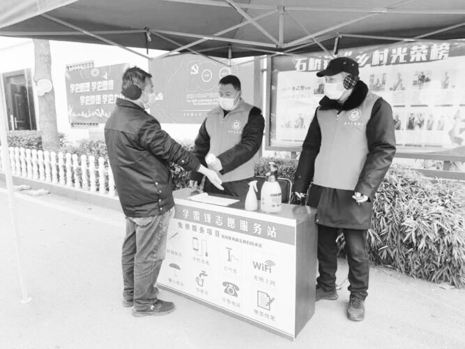 宝丰县石桥镇作为全国文明村镇之一,志愿者注册人数900余人。石桥镇充分发挥志愿者作用,使其在网格化管理中担当不可替代的重要角色。该镇志愿者协助网格员,开展“敲门”行动,在做好自身防护的前提下,摸排疫情重点地区回村人员,严密排查返回宝丰县人员。该镇在疫情重点地区回村人员家门口张贴公告,让群众共同监督,做好居家健康监测,严格落实“五包一”制度;利用条幅、大喇叭、抖音小视频等大力宣传,扩大群众对疫情防控的知晓率和覆盖面,遵循“红事缓办、白事简办”的准则,劝导外地务工的乡亲们就地过年,最大限度地减少人员流动。该镇志愿者值守在抗疫一线,扫码、测温、登记,一人一测,非本村人员、车辆严禁出入,实行24小时卡点值班制度,织密织牢疫情防控网。该镇还对残疾户、低保户等特殊群体格外关注,帮其代购生活用品,满足其日常生活需要,维持正常的生活秩序。