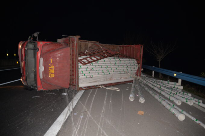 事故情况:2021年12月27日18时30分许,商丘市梁园区双八镇驾驶人荣某某驾驶车牌号为豫NY5***轻型仓栅式货车行驶到商南高速公路41KM+600M处东幅时,左后轮突然爆胎。此时,他顿时惊慌应对,急忙左打方向盘,致使车辆失控碰撞护栏后侧翻,造成车辆损坏、所载货物倾洒部分损毁及路产损失的交通事故。幸好,在此次事故中,荣某某系着安全带,没有受伤,但却被吓得不轻。