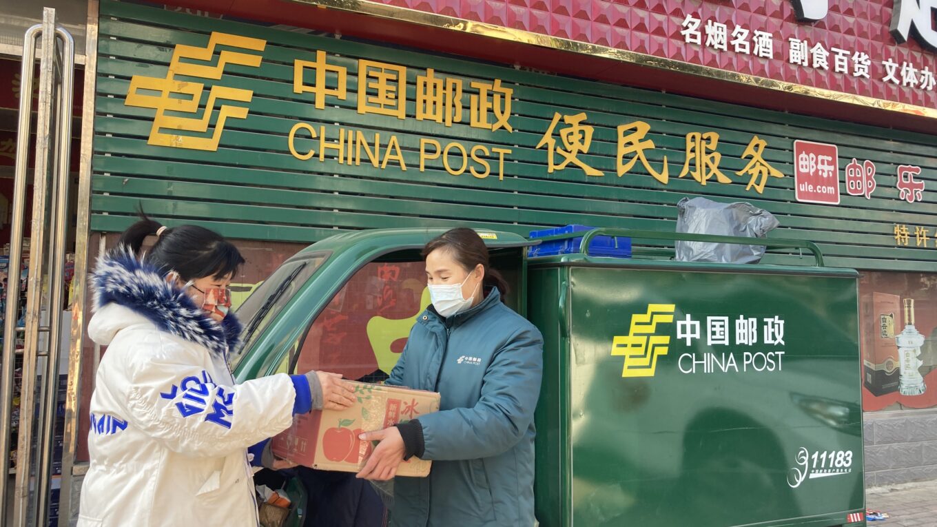 春节将至,年味渐浓。桐柏县邮政分公司紧抓春节前寄递市场需求,充分利用遍布城乡的邮政网点,大力开展优惠寄递活动,为群众购买、邮寄年货提供便利和实惠,极大地方便了群众的生活。图为桐柏县邮政分公司投递员(右)把年货送到该县城关镇南岗邮政便民服务站。