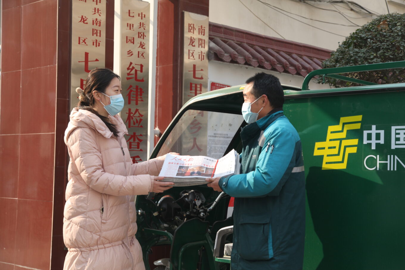 为将党的声音第一时间传递到千家万户,1月10日清晨,南阳市邮政分公司投递员提前到岗,抓紧时间分发邮件,及时出班投递,将《人民日报》等党报送到基层,让群众尽快听到党的最新声音。图为南阳市五一劳动奖章获得者、南阳市宛城区邮政分公司宛北揽投部投递员张明阳(右)把报纸及时投递到用户手中。