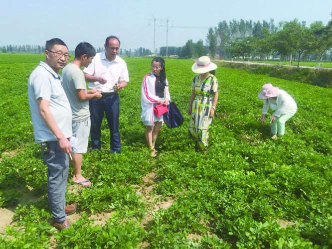 熊凤平(左三)在给种植户讲解花生病虫害防治技术。(资料图片)