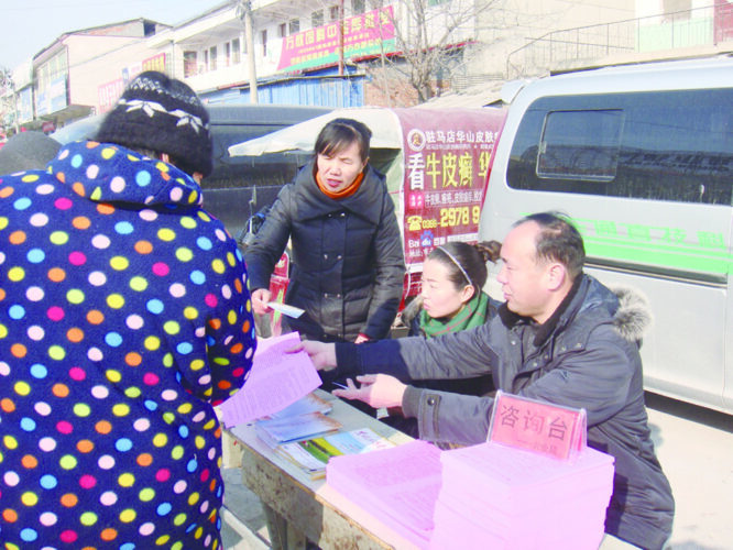 熊凤平(右一)在给农民发放农业技术资料。(资料图片)