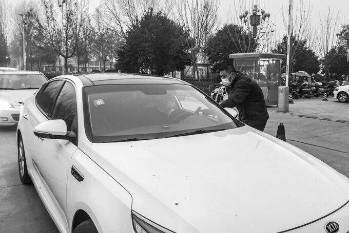 焦作市邮政分公司综合办安全保卫人员在检查出入车辆驾乘人员健康码和行程卡。