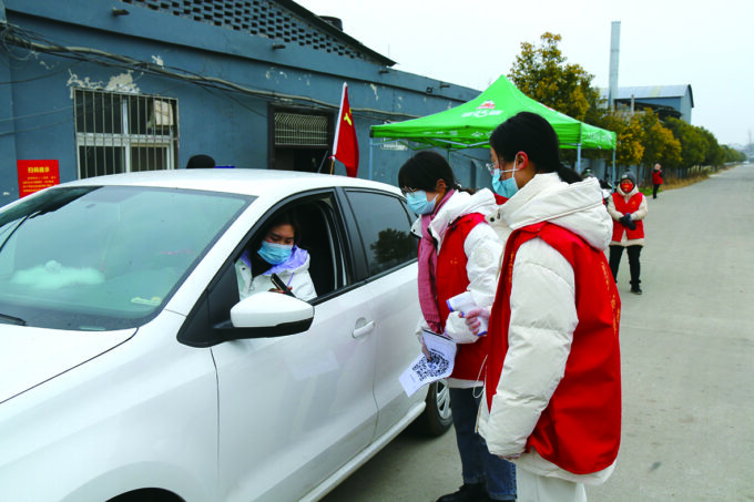 1月17日上午,在平顶山市湛河区曹镇乡曹东村疫情防控卡点,8名放寒假返乡的大学生志愿者在为过往车辆、人员登记信息,测体温,查验健康码、行程码,喷洒消毒液,宣讲疫情防控知识。