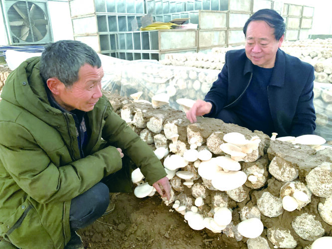 李彦增(右)在白灵菇生产基地向管理人员传经授技。