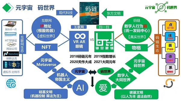 而相对于“元宇宙”的码世界,是全球扫一扫专利技术发明人徐蔚,为人类进入数字社会设计了一个基于“码”文明的人类数字化生存新生态。这个新生态通过“人类在土地上劳动创造价值的理论”,建立了一个数字人在物格数字土地上进行数字化劳动创造价值,创造数字社会,为人类在数字时代建立了一个相对于“元宇宙”的“码链数字地球”的“码世界”,即用“码”来作为人类行为数字化表达的世界。