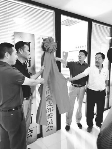 图③ 2019年7月10日上午,河南科技园区党工委书记张双喜(右二)为商会党支部揭牌。