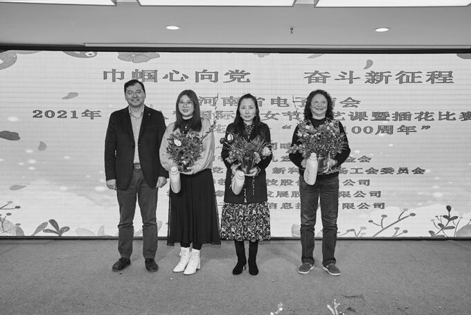 图② 郑州市金水区副区长吴怀广(左一)为三八节花艺比赛获奖人员颁奖并留念。