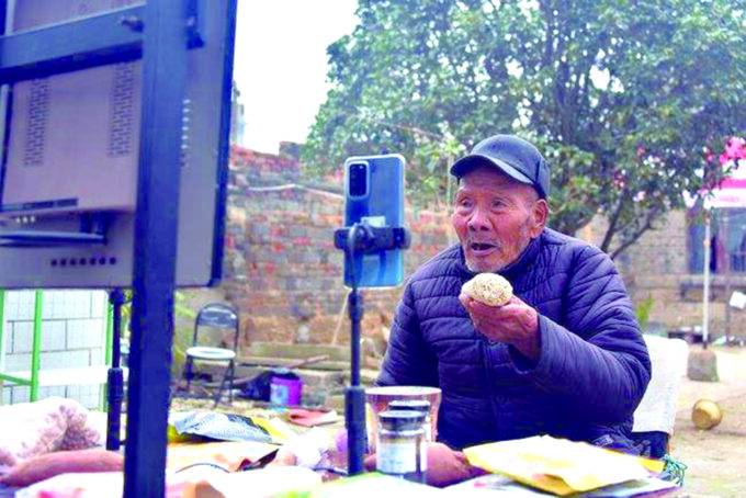 “新朋友老朋友,来到直播间都是好朋友;大家好,欢迎进入吴大爷的直播间,上点关注、下点赞,小黄车里去看看,谢谢啦……”近日,在社旗县唐庄乡潘庄村吴明春家的小院里,传来了88岁老人吴炳须铿锵纯正的“直播乡音”。而在直播屏幕前的小桌上,粉条、花生、芝麻叶等众多土特产琳琅满目、应有尽有。吴炳须是唐庄乡官营村的脱贫户,女儿吴明春是他50多岁时养育的唯一孩子。女儿出嫁后,吴炳须和患偏瘫的老伴儿一起生活。